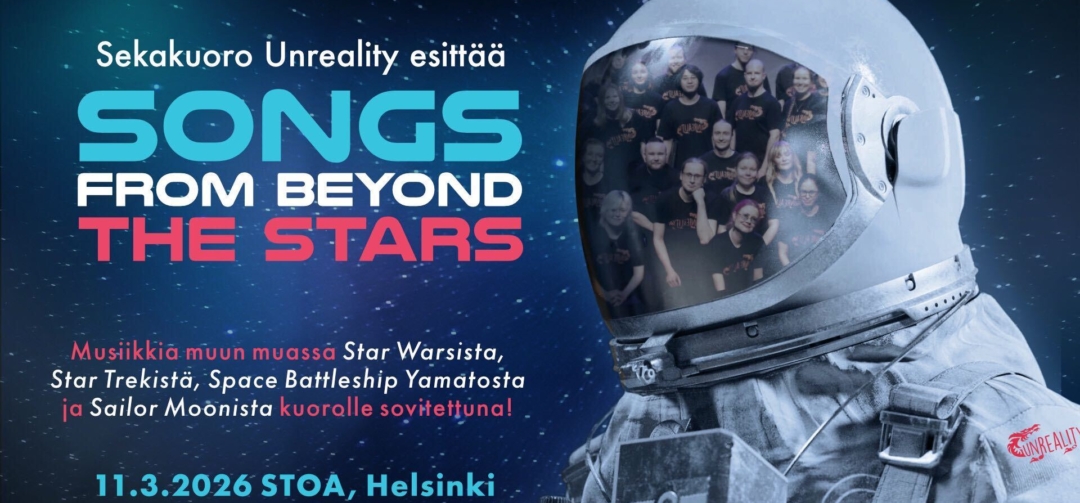 Unreality esittää Stoan teatterisalissa (Turunlinnantie 1a, 00900 Helsinki) keskiviikkona 11.3. kello 18 kokoelman eeppisiä avaruusteemaisia kappaleita elokuvista, peleistä ja TV-sarjoista. Konsertissa kuullaan musiikkia muun muassa Star Trekistä, klassikkoanime Sailor Moonista ja Civilization Beyond Earth -pelistä kuorolle sovitettuna. Kuoroa johtaa Jari Koivistoinen.